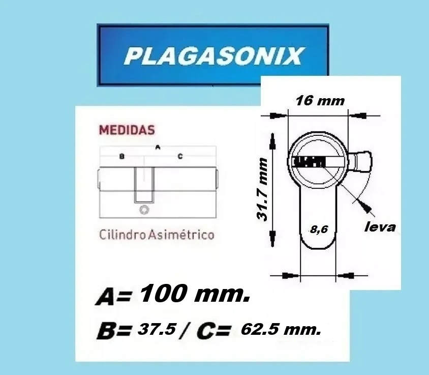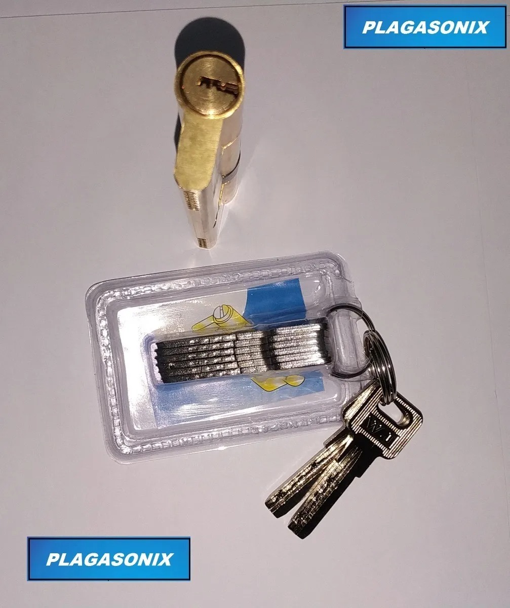 CILINDRO MULTIPUNTO (COMPUTADO). PLAGASONIX / MODELO ESPECIAL. ASIMETRICO 100mm. { 37.5 + 62.5mm.} BRONCE DORADO UNICAMENTE. * CILINDRO CON LLAVES MULTIPUNTO. * LARGO: 100 mm. EUROPERFIL. { VER PLANO EN FOTOS.} * 8 ( 2 + 1 + 5) LLAVES COMPUTADAS. * ATENCION: SISTEMA ESPECIAL. POSEE 2 LLAVES PARA USO INICIAL / LUEGO COLOCANDO LA OTRA LLAVE, SE ELIMINA LA COMBINACION DE LAS DOS LLAVES QUE SE DENOMINAN AUXILIARES / DE OBRA. { NO SE PUEDEN VOLVER A USAR LAS 2 LLAVES DE OBRA y SOLO QUEDARAN ACTIVAS LAS 6 LLAVES SEGURAS.} ** SISTEMA PARECIDO AL DENOMINADO “SEMAFORO” DE UNA CONOCIDA MARCA MUNDIAL** * CON LEVA. * ASIMETRICO { 37.5 + 62.5mm.} * COLOR CUERPO: DORADO UNICAMENTE.. * LEVA: NEGRA {SIN TORNILLO FIJACION.} * Presentacion en BOLSA. * ORIGEN: CHINA El cilindros cuenta con con 8 llaves / 2 llamadas llave de obra / Cuando decidimos usar las 6 llaves de uso definitivo debemos introducir en la cerradura la llave maestra diferente a sus 5 compañeras . Abrir y cerrar con esta llave de ambos lados . Se cambia la combinación y las llaves de obra no sirven más . ATENCIÓN: * PRODUCTO SOLO APTO PARA CERRAJEROS. * NO HACEMOS INSTALACIONES. * NO HACEMOS COPIAS DE LLAVES.