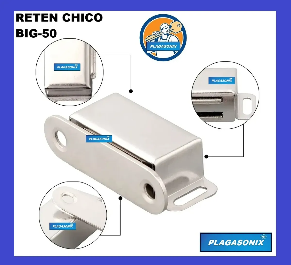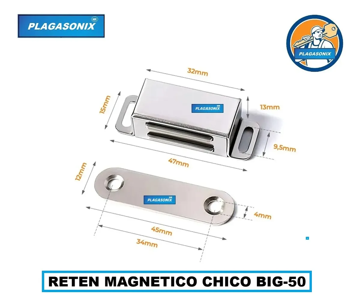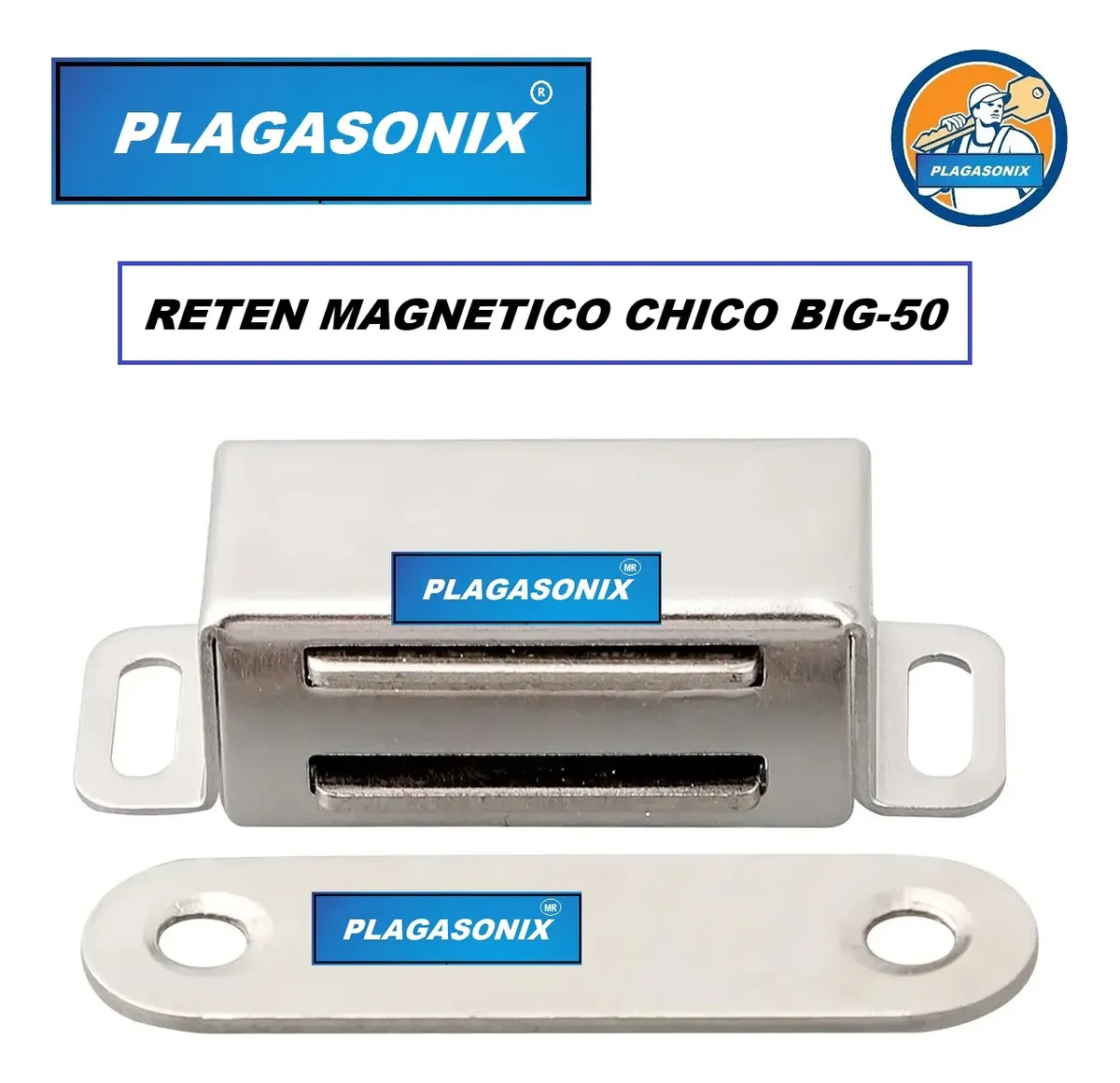 ATENCION: EL PRECIO PUBLICADO CORRESPONDE A 5 (CINCO) UNIDADES. RETEN MAGNETICO PARA PUERTAS DE MUEBLES, ALACENAS, MODULARES, METALICO EXCELENTE CALIDAD Y TERMINACION. PLAGASONIX / MODELO: “BIG-50”. / MODELO CHICO DESCRIPCION DEL PRODUCTO: * RETEN MAGNETICO PARA PUERTAS DE ALACENAS Y MUEBLES. * Sistema de traba: MAGNETICA DE ALTA POTENCIA. * Material: CUERPO DE ACERO INOXIDABLE. * MEDIDAS DEL CUERPO: 15 x 47 x 13 mm. { CONTRACHAPA DE ACERO NIQUELADO.} { VER PLANO PUBLICADO EN FOTOS.} * PRESENTACION: A GRANEL. ATENCION: EL PRECIO PUBLICADO CORRESPONDE A 5 (CINCO) UNIDADES. ATENCION: * NO HACEMOS INSTALACIONES. * NO BRINDAMOS SERVICIOS DE CERRAJERIA.